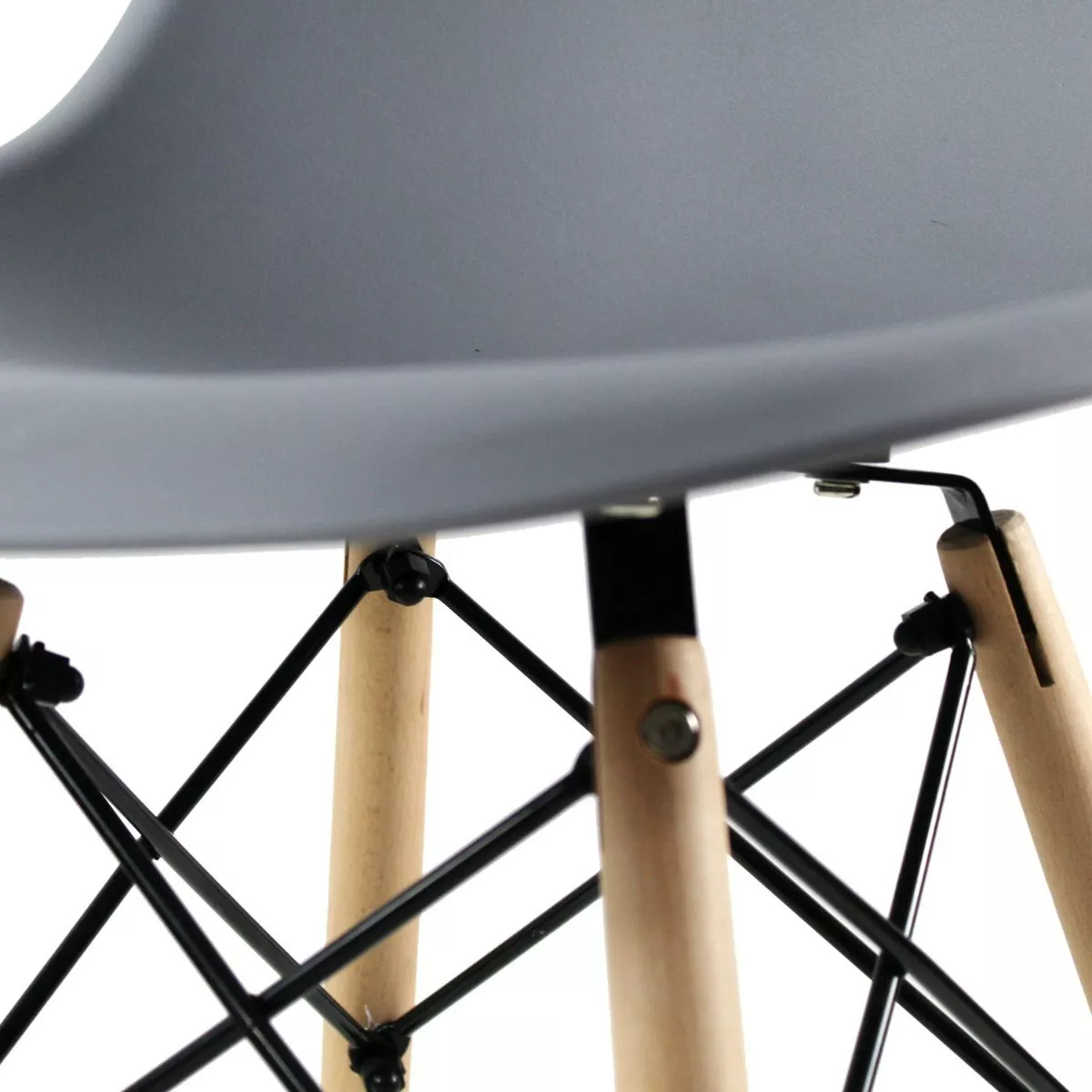 Asiento ergonómico de polipropileno y base de cuatro postes de madera con tapón de plástico flexible, unidos por varillas entrecruzadas de color negro, proporcionan comodidad y estilo.