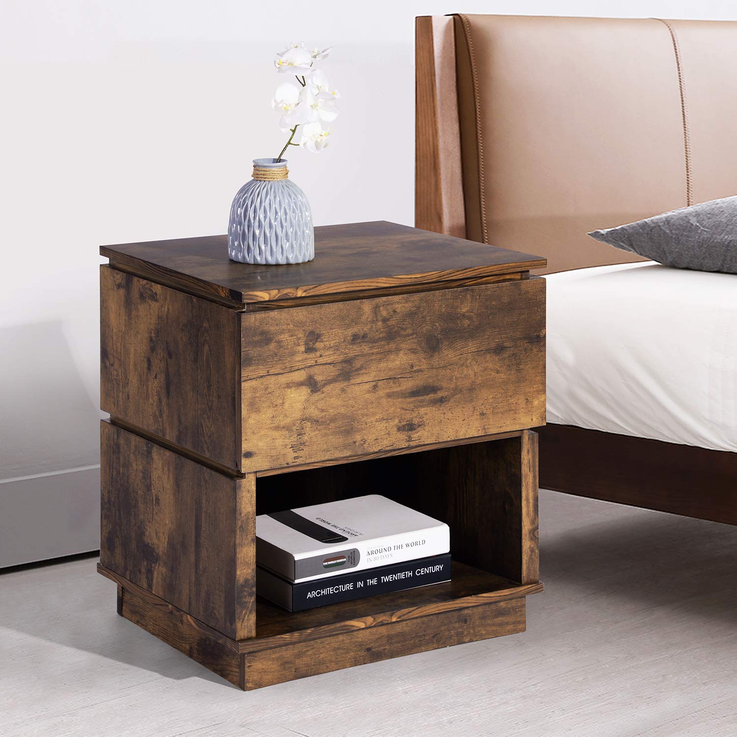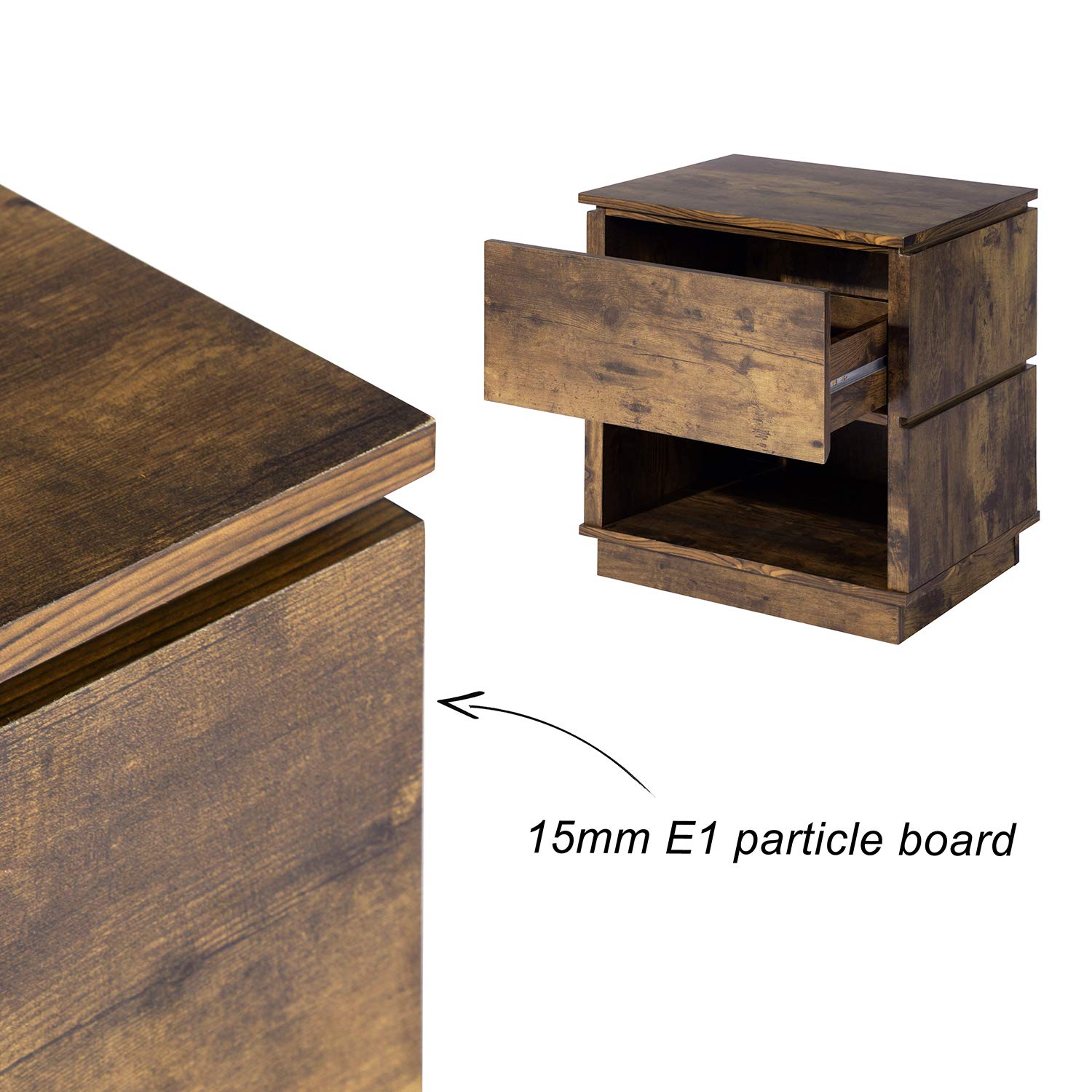 - 【Material De Alta Calidad】- La mesita de noche estaba hecha de tablero de partículas E1 de 15 MM y cubierta con PVC marrón vintage. La superficie impermeable y portátil es fácil de limpiar y garantiza años de uso.